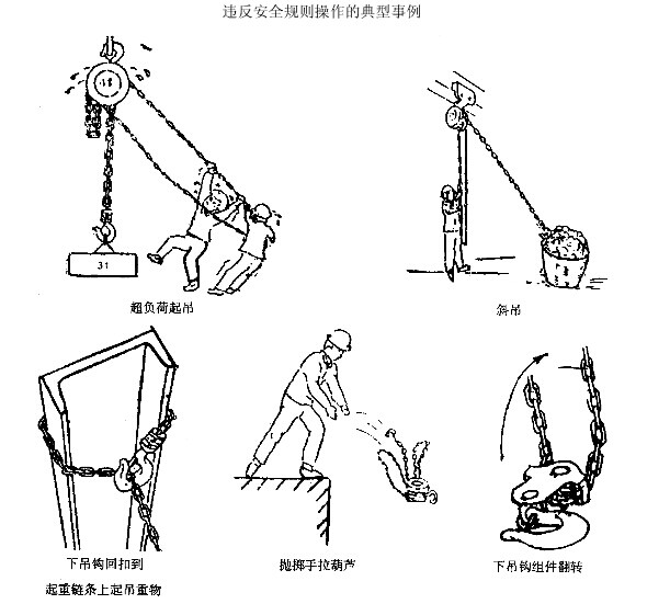 6、嚴(yán)禁將下吊鉤回扣到起重鏈條上或?qū)⑵鹬劓湕l解成單鏈捆扎重物進(jìn)行起吊重物。