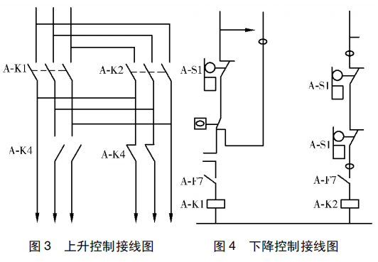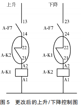 建議: 由于橋機(jī)電動葫蘆一般在檢修期使用較多,平時(shí)多為停機(jī)狀態(tài),其廠房內(nèi)震動較大,所以要注意日常維護(hù),檢查元器件是否動作良好,有無銹蝕、接線松動等現(xiàn)象,并及時(shí)處理。更改其上升/下降控制圖,如圖 5。