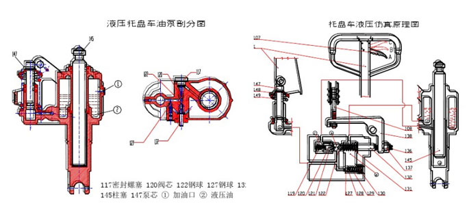 搬運(yùn)車的起升過程:將捏手107置于A位置,此時(shí)卸荷撞針132沒有抵觸鋼球122,此時(shí)搖動手柄1,泵芯147在手柄1和彈簧149的共同作用下將作往復(fù)運(yùn)動。當(dāng)泵芯147向上提升時(shí),柱塞泵a腔內(nèi)形成負(fù)壓,閥芯120和閥體121在彈簧119的作用下處于罐壁裝填,而鋼球122由于油壓作用自動打開,油壓油從貯油室F腔流經(jīng)e腔,再經(jīng)鋼球122進(jìn)入柱塞泵a腔內(nèi),柱塞泵吸油過程完成。