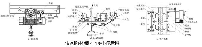 該裝置包括滾輪、支架、底板、護導輪、框座和手搖卷揚機等;底板的下面固定裝有2個滑輪,上面對稱固定裝有2個護導輪和4個鎖緊螺栓,面向起重主梁導軌的一面對稱固定有支架和框座;支架采用角鋼??蜃鶠榉娇蛐危瑑烧呦鄬Φ膬?nèi)側分別固定裝有1對滾輪,兩者間的底板上固定有護導輪和鎖緊螺栓,底板的另一面固定安裝有滑輪;框座的外側面固定安裝有手搖卷揚機,手搖卷揚機設有搖臂,輸出軸上裝有輪盤,亂盤內(nèi)裝有鋼索,鋼索穿過滑輪與吊環(huán)連接;起重主梁導軌置于護導輪、鎖緊螺栓與滾輪之間,導軌上裝有電動葫蘆起重機且一側還裝有電動葫蘆起重機快速拆裝輔助小車。