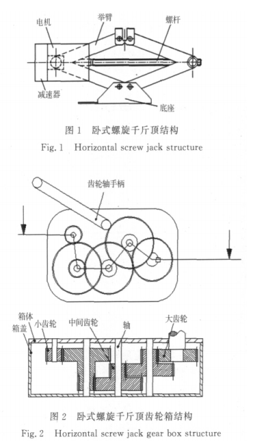 新型臥式螺旋千斤頂系統(tǒng)由電機、減速箱、上下舉臂、固定板和底座組成,且可實現(xiàn)電動與手動的快速轉(zhuǎn)換。電動時,電機可正反轉(zhuǎn)動,通過1組外嚙合圓柱齒輪減速后帶動螺桿轉(zhuǎn)動,可實現(xiàn)千斤頂?shù)捻斊稹⒒芈溥^程。手動時,可通過在齒輪箱定位孔上安裝手柄,通過首要手柄架,帶動螺桿轉(zhuǎn)動,電動與手動的快速轉(zhuǎn)換通過齒輪軸手柄裝入和取出實現(xiàn),結(jié)構簡單,切換可靠。