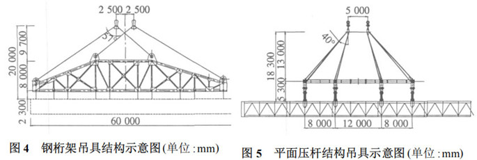 2、采用平面壓桿結(jié)構(gòu)(圖5),使吊具結(jié)構(gòu)高度降低,吊索具重量減輕。通過計(jì)算,當(dāng)?shù)跛骶呖偢邽?8.3m時,外側(cè)吊索的豎向夾角為40°,吊索角度合理,吊索直徑較小,吊索具總重約為170t,浮吊吊重富余120t,吊高富余大2.7m。吊裝安全性大幅提高。