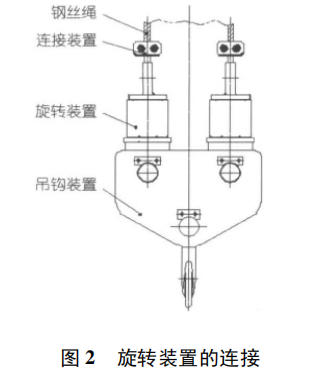 為了降低生產(chǎn)成本和減少非標(biāo)零部件的數(shù)量,在保持原有電動(dòng)葫蘆結(jié)構(gòu)不變的基礎(chǔ)上,將旋轉(zhuǎn)裝置上連接軸與葫蘆鋼絲繩通過(guò)連接件固定在一起,下連接軸與吊鉤通過(guò)銷(xiāo)軸進(jìn)行鉸接,見(jiàn)圖2。