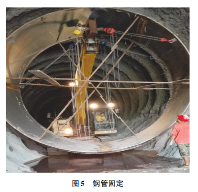 鋼管翻轉(zhuǎn)及固定:采用平板車將鋼管運(yùn)輸?shù)剿矶纯?利用洞頂錨環(huán)和卷揚(yáng)機(jī)進(jìn)行鋼管翻轉(zhuǎn)。挖掘機(jī)液壓反鏟大臂伸到鋼管內(nèi)壁頂部,將專用支架兩側(cè)的兩臺手拉葫蘆與鋼管上的錨環(huán)進(jìn)行固定。