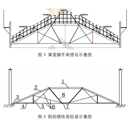 ② 鋼胎模整體安裝前,對專業(yè)分包隊伍進(jìn)行安全技術(shù)交底,在淺圓倉筒倉內(nèi)地面上按①→②→③→④→⑦→⑧→⑤→⑥組裝鋼桁架(見圖4)。