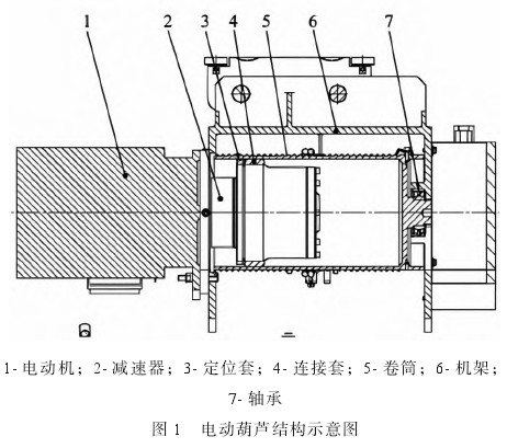 電動葫蘆由多個結(jié)構(gòu)部件組成,每個部件在設(shè)備的運(yùn)行中都扮演著至關(guān)重要的角色。電動葫蘆的基本組成包括電動機(jī)、減速器、卷筒、定位套、連接套、軸承、機(jī)架等(圖 1)。減速器的功能是把電動機(jī)的高轉(zhuǎn)速小轉(zhuǎn)矩轉(zhuǎn)換成低轉(zhuǎn)速大轉(zhuǎn)矩輸出,以帶動卷筒。鋼絲繩纏繞在卷筒上,利用卷筒的轉(zhuǎn)動完成負(fù)載的升降。定位套及連接套用來保證各零部件間的連接準(zhǔn)確,避免出現(xiàn)傳動誤差或零部件松脫現(xiàn)象。