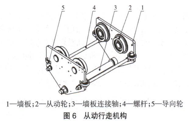 從動行走機構(gòu)不提供動力,主要作用是從結(jié)構(gòu)上保持葫蘆行走過程的穩(wěn)定。主要結(jié)構(gòu)如圖6所示,2個墻板、1個墻板連接軸以及2個螺桿組成從動行走機構(gòu)的主框架,每個墻板上分別固定有2個對稱布置的從動輪,和2套導(dǎo)向輪,從動輪踏面直徑和主動行走輪踏面直徑保持一致,保證在葫蘆行走過程中,從動輪和主動行走輪同步運行。