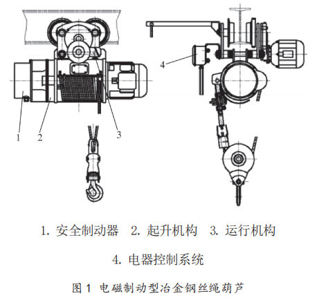 電磁制動或機械制動屬于安全制動器的范疇,此類冶金電動葫蘆類似于傳統(tǒng)的CD、MD型鋼絲繩電動葫蘆,整機串聯(lián)結構,包含起升機構、運行機構和電器控制系統(tǒng)。