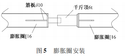 膨脹圈采用16滾弧制成,根據(jù)罐體周長分若干節(jié)制作,本工程分為4等分。膨脹圈安裝時,在膨脹圈4等分位置處用4個16t千斤頂將膨脹圈頂緊,使其緊貼在罐壁上,通過龍門卡具將膨脹圈與罐壁固定成一體,龍門卡具沿著膨脹圈每隔1m設(shè)置1個。膨脹圈用千斤頂頂緊的4個位置應(yīng)避開倒裝立柱。膨脹圈制作成型后的曲率應(yīng)和管內(nèi)壁的曲率一致,膨脹圈安裝如圖5所示。