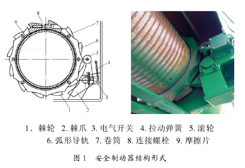 當(dāng)棘輪棘爪嚙合時(shí),滾輪按順時(shí)針方向向外旋轉(zhuǎn),帶動(dòng)其下方的小銷軸觸發(fā)電氣開關(guān),斷開電動(dòng)葫蘆下降方向的控制回路。