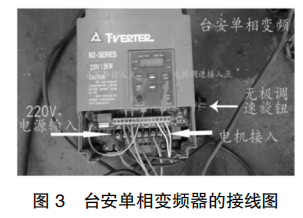 ① 采用臺安單相變頻器,代替轉(zhuǎn)子串電阻,導(dǎo)入變頻器調(diào)速程序,在接線端子處接入導(dǎo)線,實現(xiàn)無級調(diào)速。