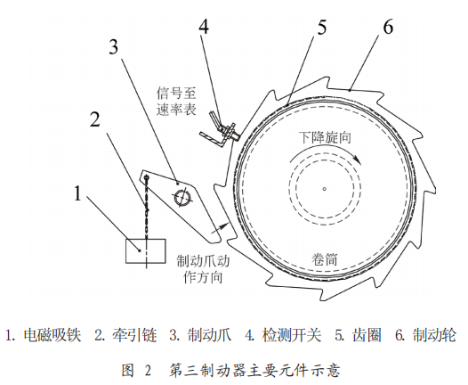 第三制動器主要部件包括速度檢測開關(guān)、齒圈、牽引電磁鐵、速率表、制動爪與制動輪等,如圖2所示。