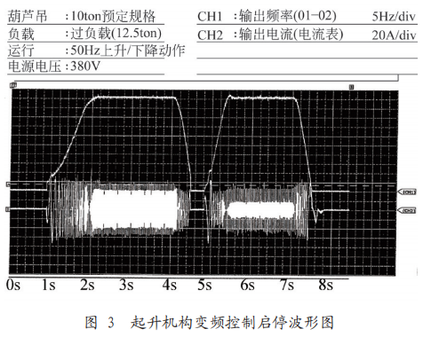 根據(jù)以往進行的變頻器用于葫蘆起升機構(gòu)的專項試驗數(shù)據(jù),采用變頻控制時,起升電機啟動、停止時變頻器輸出電流隨著輸出頻率的增減會有短時間的震蕩,此過程如未采用可靠地抗干擾措施,則可能會對其他控制性元件特別是電子器件產(chǎn)生一定的干擾從而引起其他元器件工作不正常。
