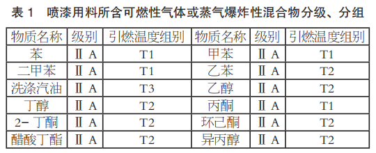 按照《爆炸危險環(huán)境電力裝置設(shè)計規(guī)范》(GB 50058-2014)的強(qiáng)制性條文,選擇隔爆型(“d”)結(jié)構(gòu)符合1區(qū)爆炸性危險區(qū)域的要求,防爆電動葫蘆采用了隔爆電動機(jī)、隔爆電氣控制柜和隔爆按鈕。噴漆用料所含可燃性氣體或蒸氣爆炸性混合物分級、分組見表1。