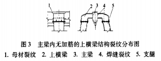 上橫梁與主梁連接處在焊縫及母材上都出現(xiàn)過裂紋,如圖3所示。主要原因是主梁內(nèi)部與上橫梁腹板連接對(duì)應(yīng)位置缺少加勁肋板,造成主梁與上橫梁之間傳力不暢,腹板局部穩(wěn)定性不足,加上焊接應(yīng)力集中,致使在連接部位造成疲勞裂紋。