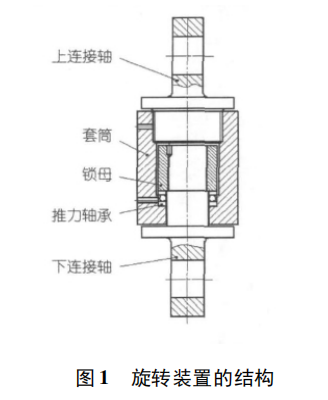 鋼絲繩旋轉(zhuǎn)裝置的結(jié)構(gòu)見圖1,上連接軸1與套筒2通過螺紋連接,并用銷釘鎖死形成一體,與此類似下連接軸5穿入套筒內(nèi)后,與套筒內(nèi)的鎖母3旋合并鎖死,這樣整個裝置就分為上下兩部分。這兩部份通過中間的推力軸承4連接起來。該裝置最大的特點在于,由于有推力軸承存在,上下兩部份可以獨立地轉(zhuǎn)動,即在上連接軸發(fā)生旋轉(zhuǎn)時,下連接軸保持不動,這正滿足了解決鋼絲繩“打麻花”問題的要求。
