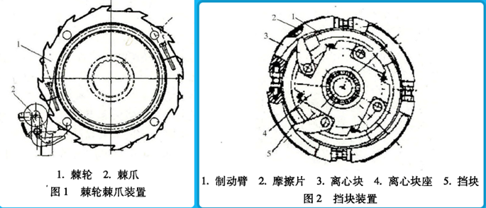 該類安全制動(dòng)裝置也是裝于減速器低速級(jí)傳動(dòng)末端卷筒的一端部,是一制動(dòng)摩擦帶和附裝有離心塊擋塊裝置。制動(dòng)摩擦帶纏于卷筒上,4塊棘輪通過高強(qiáng)螺釘壓緊制動(dòng)摩擦帶,4個(gè)離心塊和擋塊均布固定在離心塊座上,位于卷筒內(nèi)。正常情況下離心塊和制動(dòng)摩擦帶隨卷筒一同轉(zhuǎn)動(dòng),當(dāng)工作制動(dòng)器失靈或傳動(dòng)部件破斷,載荷快速下降使離心塊在離心力作用下打開,擋塊快速卡住離心塊使卷筒停住。因此,下落的重物被支持住實(shí)現(xiàn)制動(dòng)。