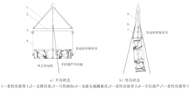 先將柔性吊裝帶穿入弓形卸扣中,再將弓形卸扣安裝于支撐吊梁的2個(gè)上吊耳上,然后將柔性吊裝帶掛入起重吊鉤中;將無(wú)接頭繩圈索具穿入弓形卸扣中,再將弓形卸扣安裝于支撐吊梁的2個(gè)下吊耳上。所有零部件裝配完成后,將無(wú)接頭繩圈索具與發(fā)電機(jī)外伸吊耳相連接,手拉葫蘆吊索上的卸扣與發(fā)電機(jī)焊接吊耳相連,然后起吊,起吊至空中后,由2個(gè)工作人員在發(fā)電機(jī)兩側(cè)拉伸手拉葫蘆的手拉鏈,直至翻轉(zhuǎn)至圖1b所示的豎吊狀態(tài),發(fā)電機(jī)翻身過(guò)程完成。