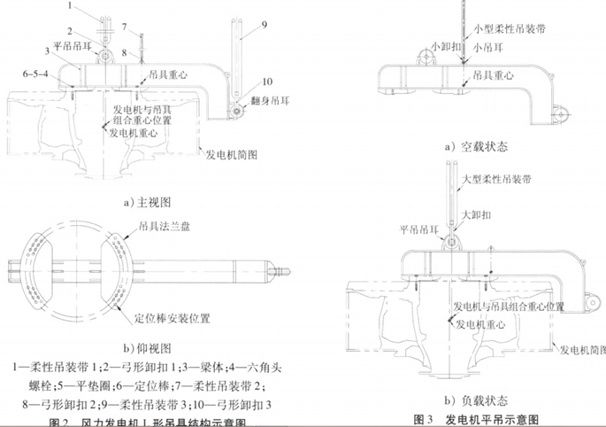 風(fēng)力發(fā)電L形平吊與翻轉(zhuǎn)吊具主要有柔性吊裝帶1、弓形卸扣1、梁體、六角頭螺栓、六角頭螺栓、平墊圈、定位棒、柔性吊裝帶2、弓形卸扣2、柔性吊裝帶3、弓形卸扣3等零部件組成。此吊具具有平吊和翻轉(zhuǎn)兩種吊裝功能,發(fā)電機(jī)裝車、卸車時可用此吊具進(jìn)行平吊吊運(yùn),上實(shí)驗(yàn)臺做試驗(yàn)時可用此吊具進(jìn)行翻轉(zhuǎn),結(jié)構(gòu)簡單,操作方便,翻身快捷。