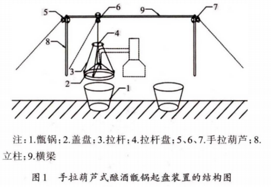 甑桶蒸餾技術(shù)不僅操作簡(jiǎn)單,還能保證酒味純正,因?yàn)樵诎拙粕a(chǎn)過程中被廣泛應(yīng)用。為了減少起盤、封盤過程中的勞動(dòng)量,設(shè)計(jì)了一種手拉葫蘆式釀酒甑鍋起盤裝置。要求該裝置在將蓋盤上拉過程中可減少所需拉力,待蓋盤上升至所需高度后可使蓋盤在兩口甑鍋之間來回移動(dòng),移動(dòng)過程中不可使蓋盤搖擺幅度過大,最終達(dá)到省時(shí)、省力、方便的效果,消除在生產(chǎn)過程中存在刮傷、燙傷的安全隱患。