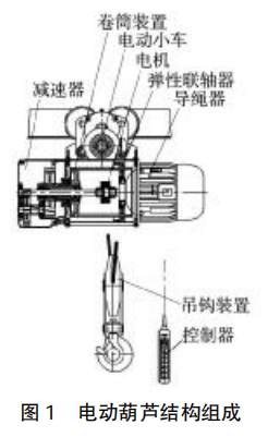 電動葫蘆通常稱為電葫蘆,是一種常見的輕小型的起重設(shè)備。常見電動葫蘆的控制方式有兩種,一是使用按鈕在地面跟隨操作,二是在司機室內(nèi)操控或采用無線遠(yuǎn)距離控制。電動葫蘆一般由電機、傳動機構(gòu)和卷筒裝置或鏈輪機構(gòu)組成。電動葫蘆可以分為鋼絲繩電動葫蘆和環(huán)鏈電動葫蘆兩種。鋼絲繩電動葫蘆可以分為鋼絲繩電動葫蘆和環(huán)鏈電動葫蘆兩種。鋼絲繩電動葫蘆又可以分為單速提升型、雙速提升型、微型電動葫蘆、卷揚機、多功能提升機等多種類型。化工廠常用電葫蘆為微型電動葫蘆或懸臂葫蘆,往往在加料或維修車間頻繁進(jìn)行檢維修作業(yè)的固定點位安裝,設(shè)備拆裝位置因綜合考慮現(xiàn)場空間安全和建造成本往往不會安裝電動葫蘆,化工廠常用電動葫蘆結(jié)構(gòu)組成如圖1所示。