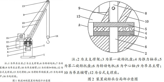 主支撐架的上部設(shè)有帶轉(zhuǎn)動(dòng)電機(jī)安裝槽,轉(zhuǎn)動(dòng)電機(jī)的輸出端依次貫穿安裝 槽的上側(cè)壁、推力軸承和第一旋轉(zhuǎn)托盤與帶中心軸的 第二旋轉(zhuǎn)托盤固定連接。中心軸上固定連接有包括吊具主臂和吊具輔臂的吊具臂,吊具主臂與中心軸通過螺栓固定連接,吊具主臂和吊具輔臂之間設(shè)有若干補(bǔ)強(qiáng)加勁板。吊具主臂的一側(cè)設(shè)有上端帶電動(dòng)葫蘆臺(tái)式 支撐座和定滑輪,吊具輔臂的一側(cè)設(shè)有滑輪吊鉤裝置,電動(dòng)葫蘆的鋼絲繩端依次貫穿定滑輪和滑輪吊鉤裝置 后與吊具輔臂的上端固定連接,滑輪吊鉤作用在待回收的軌道上通過電動(dòng)葫蘆和鋼絲繩作用定滑輪,使得 滑輪吊鉤對(duì)待回收軌道進(jìn)行提吊拖拉,通過旋轉(zhuǎn)電機(jī)能夠驅(qū)動(dòng)第二旋轉(zhuǎn)托盤及與其相連接的吊具臂旋轉(zhuǎn),待回收軌道提拉旋轉(zhuǎn)至合適位置后,將待回收軌道放置于軌道運(yùn)輸平車上,完成鋼混橋梁的架橋機(jī)軌道回收。臺(tái)式支撐座的下端設(shè)電控箱,通過電控箱對(duì)電動(dòng)葫蘆和轉(zhuǎn)動(dòng)電機(jī)進(jìn)行控制,電控箱分別與電動(dòng)葫蘆和轉(zhuǎn)動(dòng)電機(jī)電性連接。電控箱的表面設(shè)有防腐涂層,通過防腐涂層能夠讓電控箱在施工現(xiàn)場(chǎng)的較差環(huán)境中具有更長(zhǎng)的使用壽命。吊具臺(tái)座的底部設(shè)有防滑墊,通過防滑墊能夠讓本裝置在使用時(shí)更加穩(wěn)定。吊具臺(tái)座的內(nèi)部設(shè)有重力塊,通過重力塊能夠讓本裝置在使用時(shí)更加穩(wěn)定。