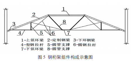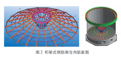 (2)鋼桁架倉內(nèi)地面組裝。①將淺圓倉內(nèi)地面回填并平整,便于地面組裝鋼胎模架。在倉內(nèi)中心地坪上搭設(shè)長 6m× 寬 6m× 高 3m 的滿堂鋼管腳手架,在滿堂鋼管支撐架頂部滿鋪跳板組成上弦環(huán)梁安裝操作平臺。將上弦環(huán)梁在倉外平坦地面組裝好后,用塔吊吊至倉底預(yù)先搭好的滿堂鋼管支撐架上,在吊裝就位前按照預(yù)設(shè)的線將上弦環(huán)梁上螺栓孔對準(zhǔn)筒倉壁牛腿預(yù)埋鋼板的中心。此外,照設(shè)計要求搭設(shè)26榀鋼桁架,用高強(qiáng)螺栓將 H 型鋼桁架鋼梁與上弦環(huán)梁連接成整體后,進(jìn)行其他組件