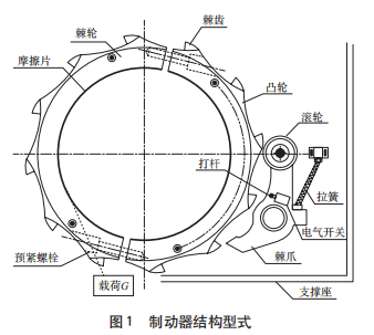 安全制動器結構型式如圖 1 所示,當負載下降時,卷筒逆時針方向旋轉,滾輪在凸輪的激勵下帶動擺臂做周期性擺動。當彈簧作拉力不足以克服擺臂擺動力時,擺動傾角逐漸加大直至帶動棘爪與棘齒嚙合,此時打桿觸發(fā)電氣開關,斷開下降方向的控制回路,棘輪通過摩擦阻力實現(xiàn)減速制停。